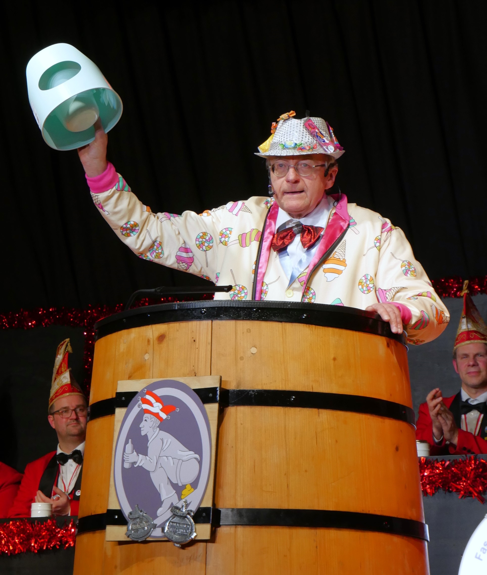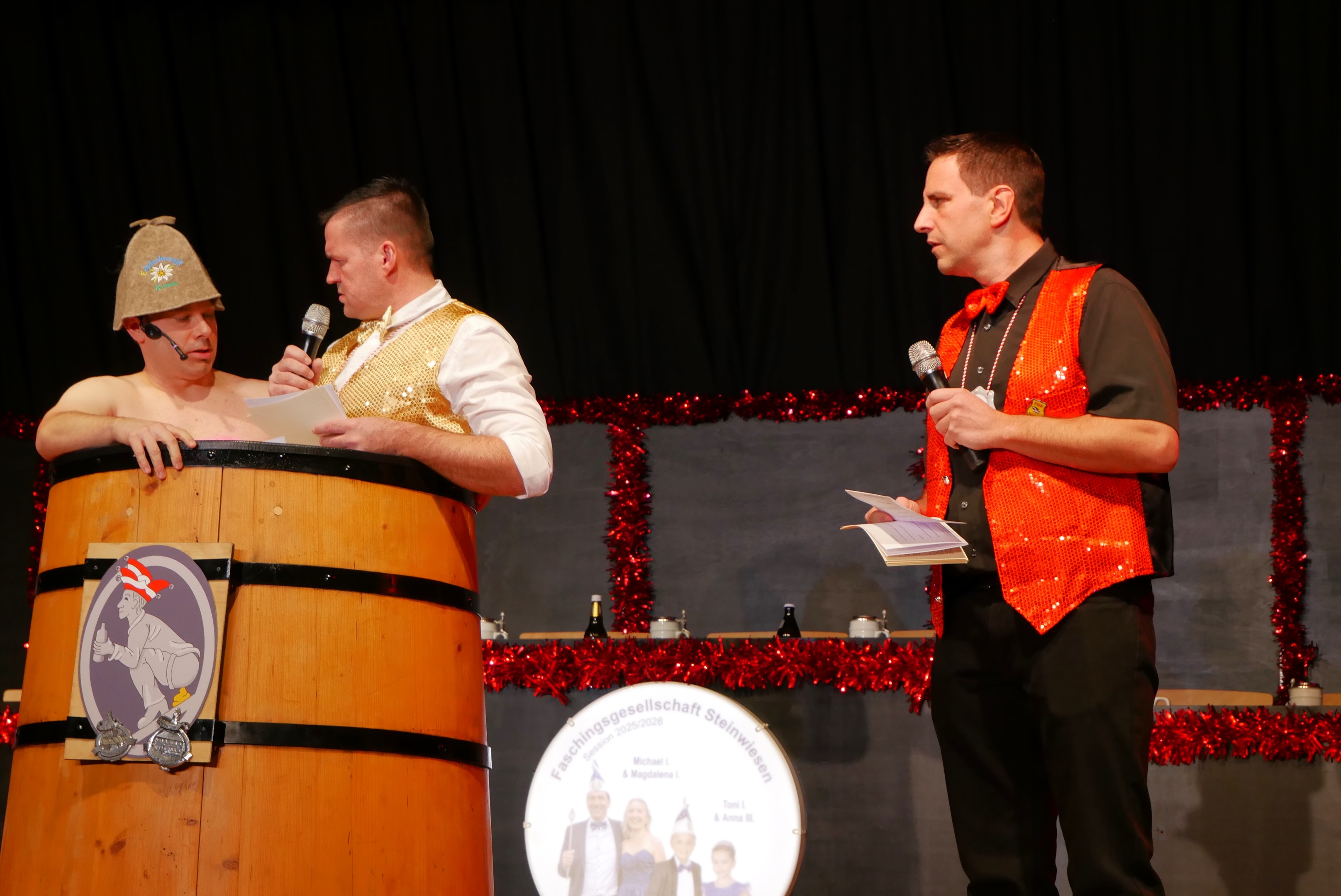 Was macht ein Präsident, der statt zum Büttenabend plötzlich zum Saunaabend kommt? Er zerrt den Moderator mit in das Saunafass und eröffnet den Abend im Badetuch. Und was für einen Abend. Nach dem Einschießen des Faschings durch „Blacky II“ jagte ein Highlight das andere. Junge und reife Narren branden ein Feuerwerk an Sketchen, Witzen, Tänzen und einigen Überraschungen ab. Stargast Klaus Karl-Kraus stolzierte als Ministrant und bekennender „Glubberer“ über die Bühne und stellte fest, dass man sich nicht mit jedem Vollpfosten gutstellen muss. Andere waren ein wenig zurückhaltender und erzählten aus ihrem Alltag, so wie Moritz Feil oder zogen in den Wahlkampf wie Wieland Beierkuhnlein als „Candydate“. Nach einigen Jahren Abstinenz wieder dabei waren die Nochdgläzz Danzäs als „Italianos“ und die Koslowskis, wo der arme Reinhard schon mit einem Bein im Grab stand, weil er den Geburtstag von Gattin Gisela vergessen hatte. Mystisch wurde es bei den „Crazy Chicks“, die mit Schwarzlicht und einem riesigen Joint die Bühne in schwarz und weiß tauchten. Was wäre ein Büttenabend ohne die tollen Auftritte des Elferrates? Richtig, sie wären langweilig und deshalb lue hden sieuer in ein Museum ein. Weltberühmte Bilder und Statuen standen hier. Die Mona Lisa (Markus Schmittdorsch), der Mann mit dem Goldhelm (Johannes Schmidt) oder auch „der Schrei“ (Herbert Wessel) wurden so richtig gesprächig, als die beiden Putzfrauen in die Pause gingen. Auch der „Zwerg vom Berg“ lag in einem gläsernen Sarg, aber er wurde von Schneewittchen erweckt und wird im nächsten Jahr wieder dabei sein.