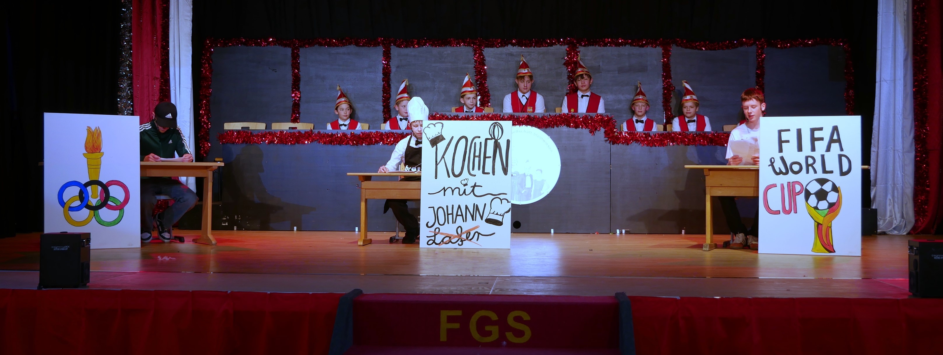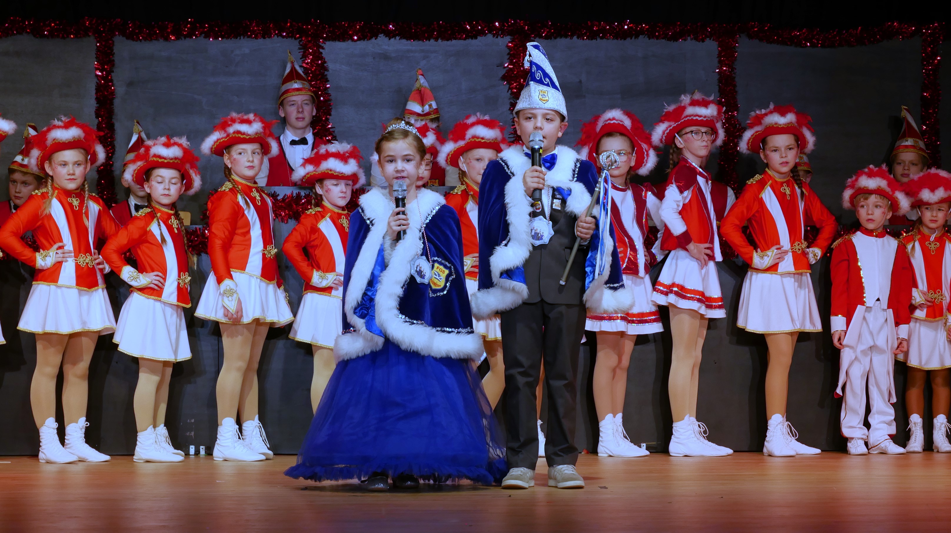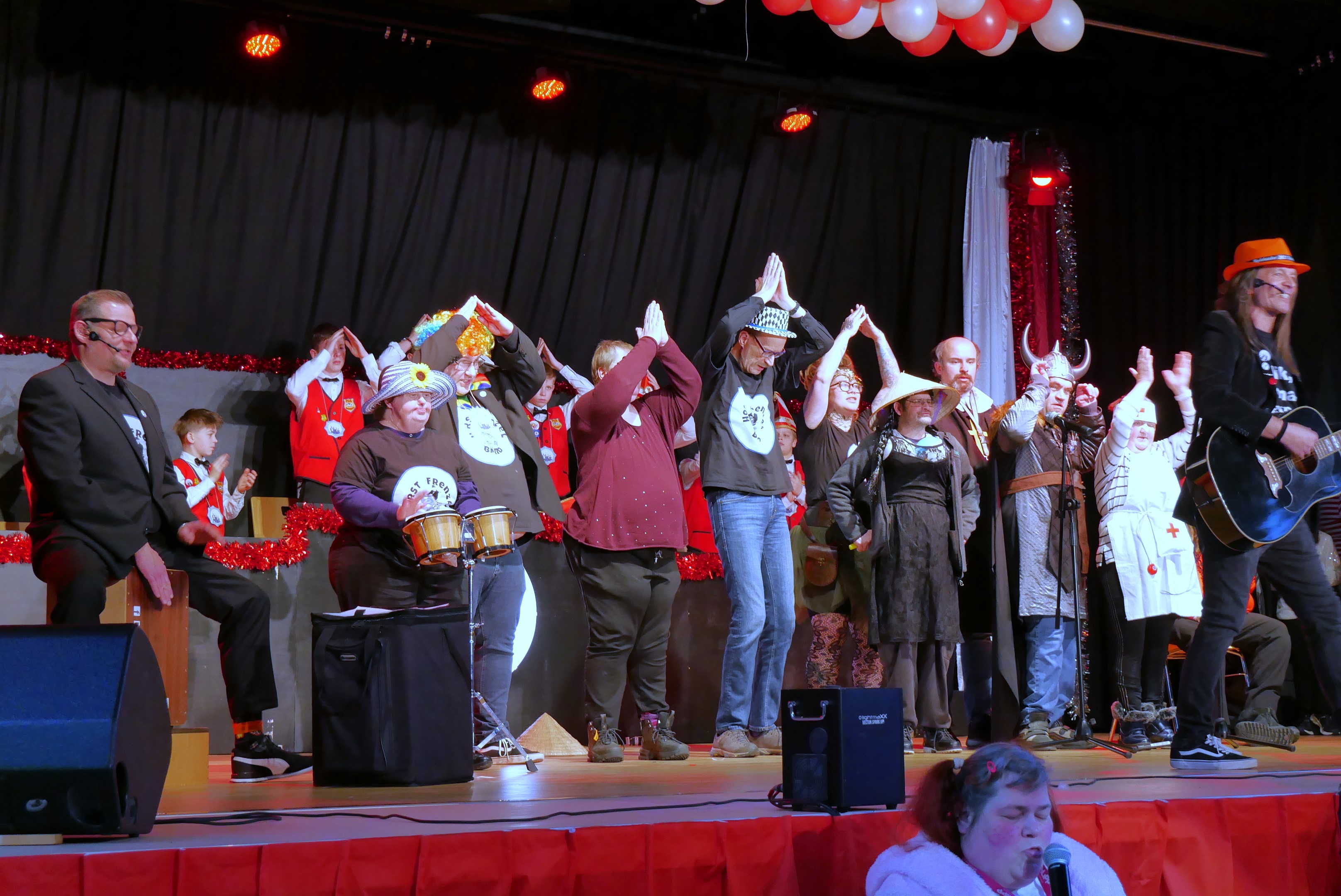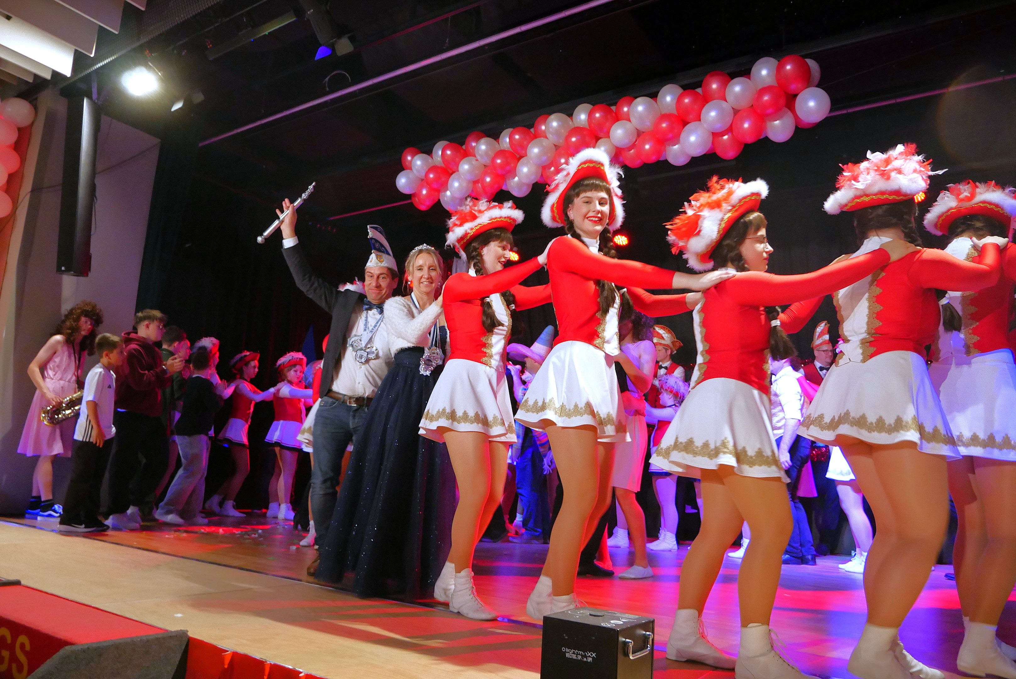 Toll herausgeputzte Gardemädels der Kindergarde, Juniorengarde und der Prinzengarde verzauberten mit ihren Tänzen. Die Tanzmariechen Lotti, Elisa und Julia wirbelten über die Bühne, dass einem ganz schwindlig wurde. Stolz auf ihr großes Gefolge verkündete das Kinderprinzenpaar Toni I. und Anna III., dass es das Schönste ist, dass alle machen müssen was sie sagen. Das „große“ Prinzenpaar Michael I. und Magdalena I. begrüßten alle im Saal und wünschten mit einem kräftigen dreifachen Helau vor allem den Kindern viel Spaß. Als „Special-Gast“ war auch in diesem Jahr die „Horst Frenzel Bänd“ der Lebenshilfe Kronach mit ihrem Leadsänger Wiktor Mühlberger (Steffen Prell) mit dabei und rockte zusammen mit den vielen Kindern die Bühne. Moritz Feil erzählte aus seinem Leben und mit Sketchen der Jungs, der Grundschüler und des Jugendelferrats war es ein sehr vergnüglicher Nachmittag. Die Vorschulkinder des Kindergartens St. Marien strahlten in Sonnengelb und immer wieder wurde das „Mitmachlied“ zur Guten Laune angestimmt. Im Foyer lud eine Fotobox für Familienfotos ein und wer wollte, kam in den Lostopf und konnte einen der drei Preise gewinnen. Für die musikalische Unterhaltung des Nachmittags war Musikant Ali zuständig, der oft und gerne seine Schunkelrunden ins Programm brachte.